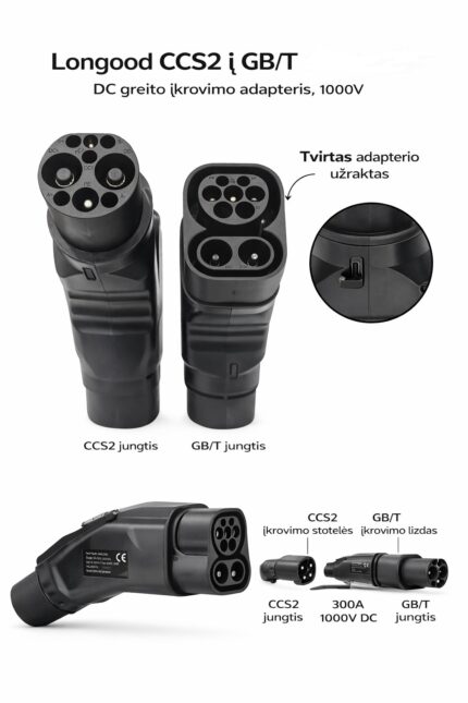 Longood CCS2 į GB/T adapteris leidžia GB/T standartą naudojantiems elektromobiliams krautis CCS2 greito įkrovimo stotelėse. Adapteris palaiko iki 300A ir 1000V DC, turi IP54 apsaugą bei patvarią ugniai atsparią konstrukciją.
